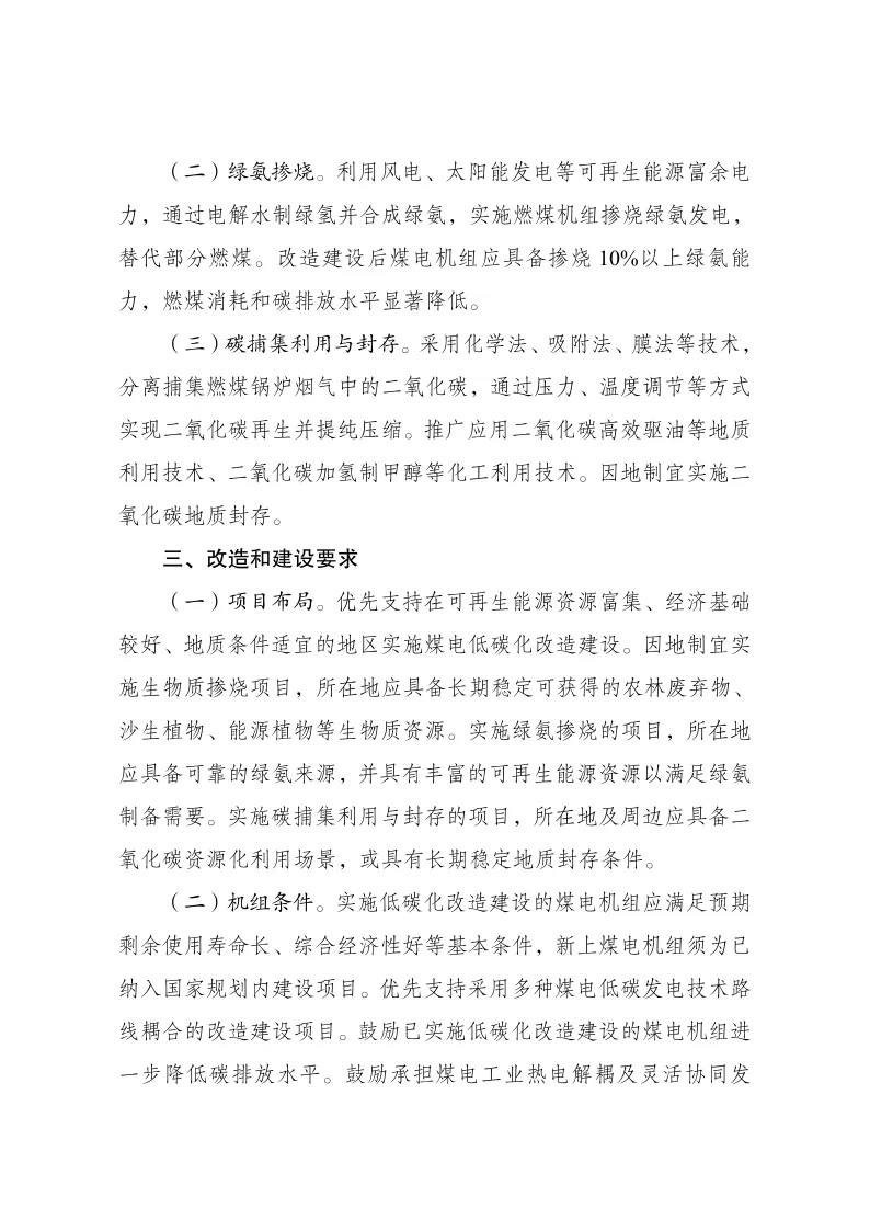 其中指出:利用風(fēng)電、太陽能發(fā)電等可再生能源富余電力,通過電解水制綠氫并合成綠氨,實施燃煤機組摻燒綠氨發(fā)電,替代部分燃煤。改造建設(shè)后煤電機組應(yīng)具備摻燒10%以上綠氨能力,燃煤消耗和碳排放水平顯著降低。二、改造和建設(shè)方式(二)綠氨摻燒。利用風(fēng)電、太陽能發(fā)電等可再生能源富余電力,通過電解水制綠氫并合成綠氨,實施燃煤機組摻燒綠氨發(fā)電,替代部分燃煤。改造建設(shè)后煤電機組應(yīng)具備摻燒10%以上綠氨能力,燃煤消耗和碳排放水平顯著降低。(三)碳捕集利用與封存。采用化學(xué)法、吸附法、膜法等技術(shù),分離捕集燃煤鍋爐煙氣中的二氧化碳,通過壓力、溫度調(diào)節(jié)等方式實現(xiàn)二氧化碳再生并提純壓縮。推廣應(yīng)用二氧化碳高效驅(qū)油等地質(zhì)利用技術(shù)、二氧化碳加氫制甲醇等化工利用技術(shù)。因地制宜實施二氧化碳地質(zhì)封存。三、改造和建設(shè)要求(一)項目布局實施綠氨摻燒的項目,所在地應(yīng)具備可靠的綠氨來源,并具有豐富的可再生能源資源以滿足綠氨制備需要。實施碳捕集利用與封存的項目,所在地及周邊應(yīng)具備二氧化碳資源化利用場景,或具有長期穩(wěn)定地質(zhì)封存條件。(二)機組條件。鼓勵承擔(dān)煤電工業(yè)熱電解耦及靈活協(xié)同發(fā)電、煤電安全高效深度調(diào)峰等技術(shù)攻關(guān)任務(wù)的機組實施低碳化改造。鼓勵煤炭與煤電聯(lián)營、煤電與可再生能源聯(lián)營“兩個聯(lián)營”和沙漠、戈壁、荒漠地區(qū)大型風(fēng)電光伏基地配套煤電項目率先實施綠氨摻燒示范。煤電低碳化改造建設(shè)項目應(yīng)嚴格執(zhí)行環(huán)境管理制度,確保各類污染物達標排放。綠氨摻燒項目氨存儲設(shè)施原則上應(yīng)建于煤電機組廠區(qū)外,項目實施單位應(yīng)進一步明確并嚴格執(zhí)行具體管理要求。四、保障措施(三)優(yōu)化電網(wǎng)運行調(diào)度。研究制定煤電低碳化改造建設(shè)項目碳減排量核算方法。推動對摻燒生物質(zhì)/綠氨發(fā)電、加裝碳捕集利用與封存設(shè)施部分電量予以單獨計量。(四)加強技術(shù)創(chuàng)新應(yīng)用。加強煤電摻燒生物質(zhì)、低成本綠氨制備、高比例摻燒農(nóng)作物秸稈等技術(shù)攻關(guān)。原文如下:(來源: 氫能觀察)請點擊查看通知原文